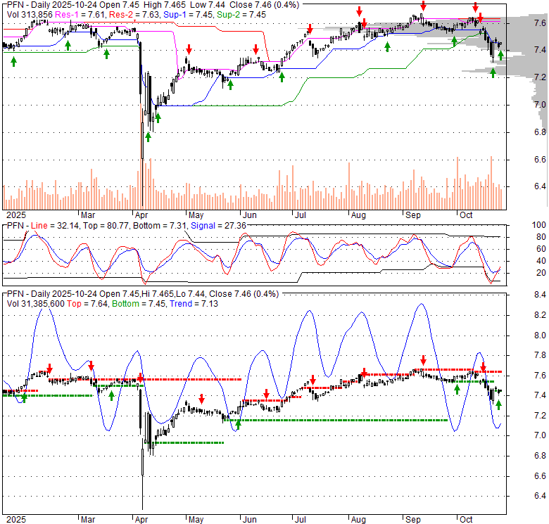 Price has closed above its short-term moving average. Short-term moving average is currently below mid-term; and below long-term moving average. From the relationship between price and moving averages: This stock is NEUTRAL in short-term; and NEUTRAL in mid-long term.[ PFN ] has closed above bottom band by 25.6%. Bollinger Bands are 89% wider than normal. The large width of the bands suggest high volatility as compared to its normal range. The bands have been in this wide range for 4 days. This is a sign that the current trend might continue.
