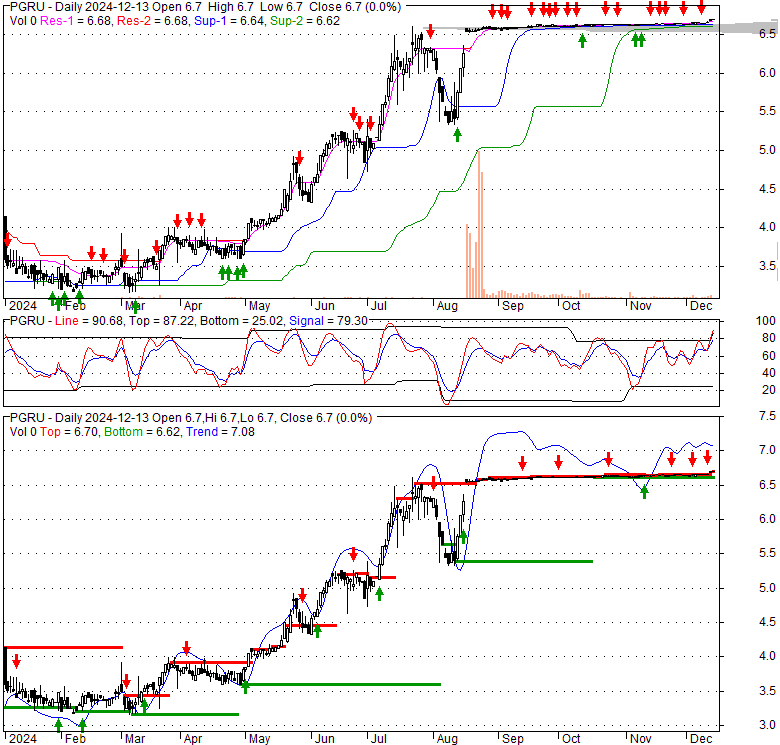 Price has closed above its short-term moving average. Short-term moving average is currently above mid-term; and above long-term moving average. From the relationship between price and moving averages: This stock is BULLISH in short-term; and BULLISH in mid-long term.[ PGRU ] has closed Bollinger Bands are 82% narrower than normal. The narrow width of the bands suggests low volatility as compared to its normal range. The bands have been in this narrow range for 70 bars. This is a sign that the market may be about to initiate a new trend.