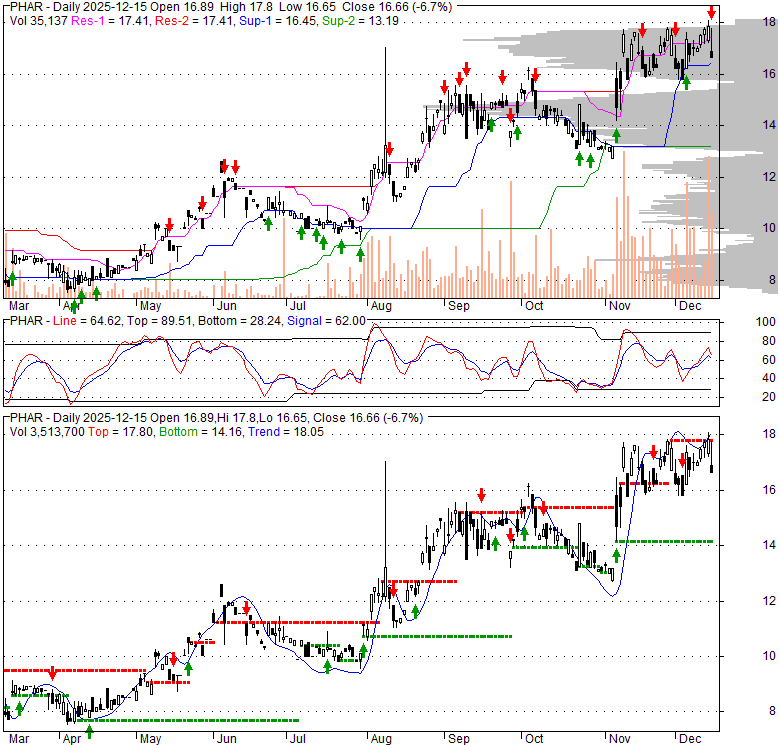 Price has closed below its short-term moving average. Short-term moving average is currently above mid-term; and above long-term moving average. From the relationship between price and moving averages: This stock is NEUTRAL in short-term; and BULLISH in mid-long term.[ PHAR ] has closed above bottom band by 34.2%. Bollinger Bands are 21.9% narrower than normal. The current width of the bands does not suggest anything about the future direction or movement of prices.