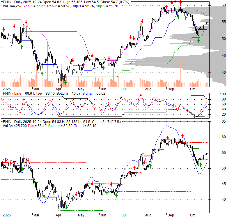 Price has closed above its short-term moving average. Short-term moving average is currently below mid-term; and above long-term moving average. From the relationship between price and moving averages: This stock is NEUTRAL in short-term; and NEUTRAL in mid-long term.[ PHIN ] has closed below upper band by 14.4%. Bollinger Bands are 21.4% narrower than normal. The current width of the bands does not suggest anything about the future direction or movement of prices.