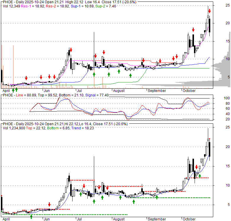 Price has closed below its short-term moving average. Short-term moving average is currently above mid-term; and above long-term moving average. From the relationship between price and moving averages: This stock is NEUTRAL in short-term; and BULLISH in mid-long term.[ PHOE ] has closed below upper band by 34.0%. Bollinger Bands are 164.6% wider than normal. The large width of the bands suggest high volatility as compared to its normal range. The bands have been in this wide range for {EMPTY} days. This is a sign that the current trend might continue.