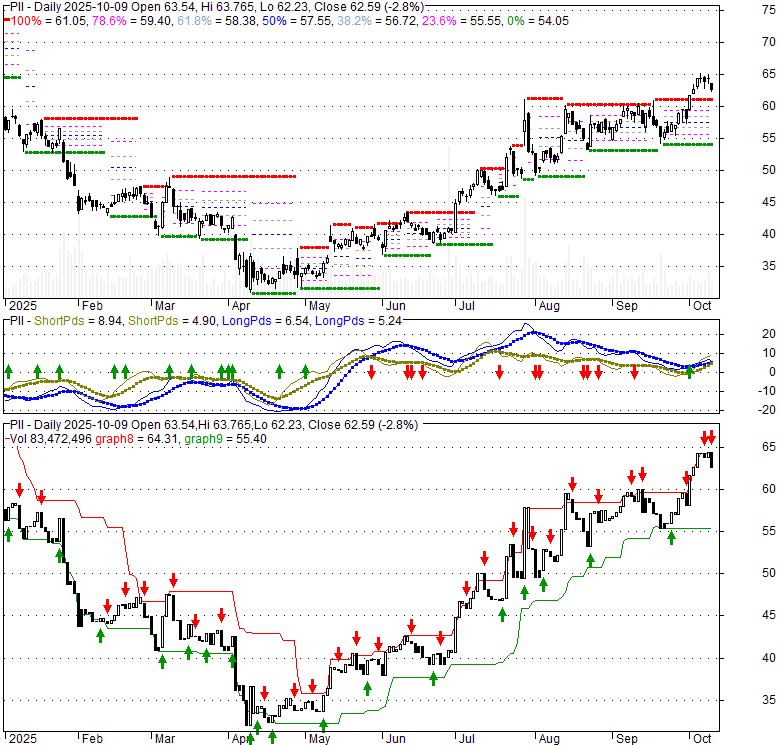 Price has closed below its short-term moving average. Short-term moving average is currently above mid-term; and above long-term moving average. From the relationship between price and moving averages: This stock is NEUTRAL in short-term; and BULLISH in mid-long term.[ PII ] has closed below upper band by 30.1%. Bollinger Bands are 64.2% wider than normal. The large width of the bands suggest high volatility as compared to its normal range. The bands have been in this wide range for 3 days. This is a sign that the current trend might continue.