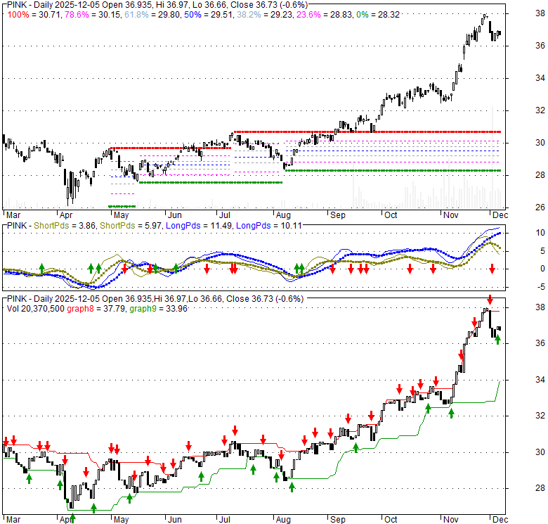 Price has closed below its short-term moving average. Short-term moving average is currently above mid-term; and above long-term moving average. From the relationship between price and moving averages: This stock is NEUTRAL in short-term; and BULLISH in mid-long term.[ PINK ] has closed above bottom band by 43.0%. Bollinger Bands are 3.8% wider than normal. The current width of the bands does not suggest anything about the future direction or movement of prices.