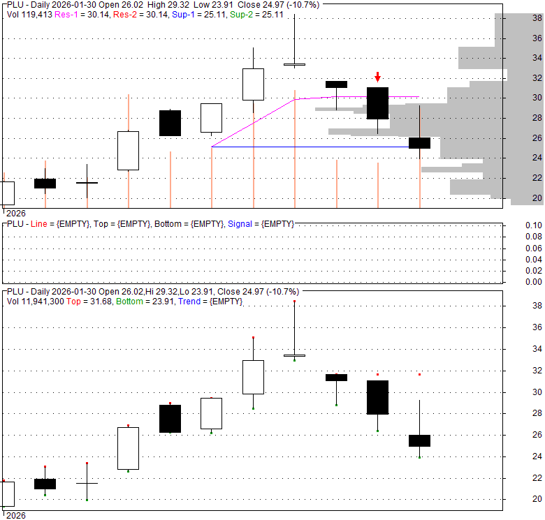 Price has closed below its short-term moving average. Short-term moving average is currently below mid-term; and below long-term moving average. From the relationship between price and moving averages: This stock is NEUTRAL in short-term; and NEUTRAL in mid-long term.[ PLU ] has closed Bollinger Bands are 0% narrower than normal.