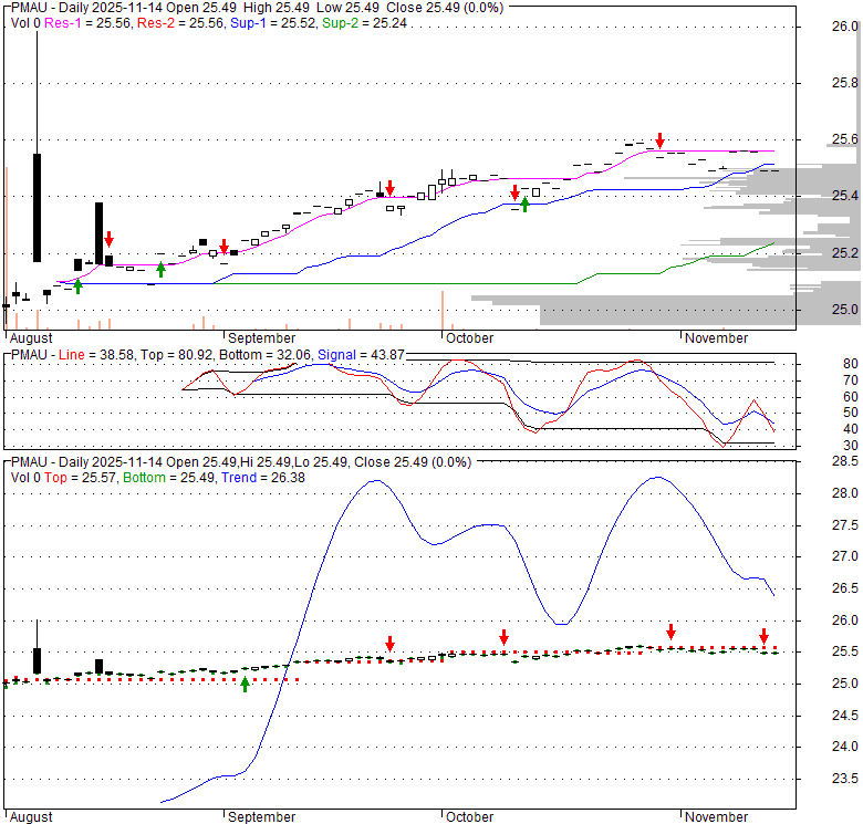 Price has closed below its short-term moving average. Short-term moving average is currently above mid-term; and below long-term moving average. From the relationship between price and moving averages: This stock is NEUTRAL in short-term; and NEUTRAL in mid-long term.[ PMAU ] has closed above bottom band by 13.2%. Bollinger Bands are 0% narrower than normal.