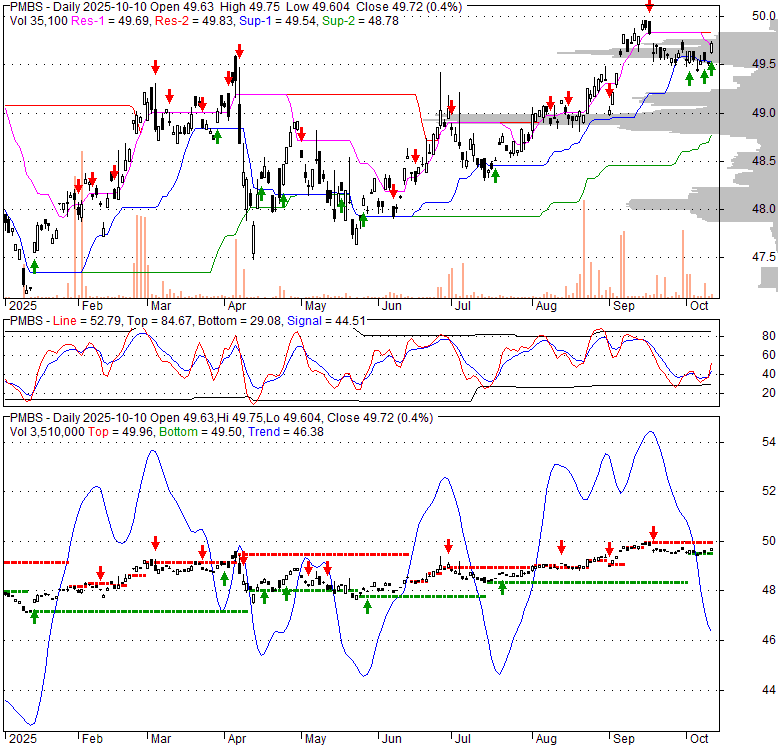 Price has closed above its short-term moving average. Short-term moving average is currently above mid-term; and above long-term moving average. From the relationship between price and moving averages: This stock is BULLISH in short-term; and BULLISH in mid-long term.[ PMBS ] has closed It is unclear right now based on current values. 61.9% narrower than normal. The narrow width of the bands suggests low volatility as compared to its normal range. The bands have been in this narrow range for 4 bars. This is a sign that the market may be about to initiate a new trend.