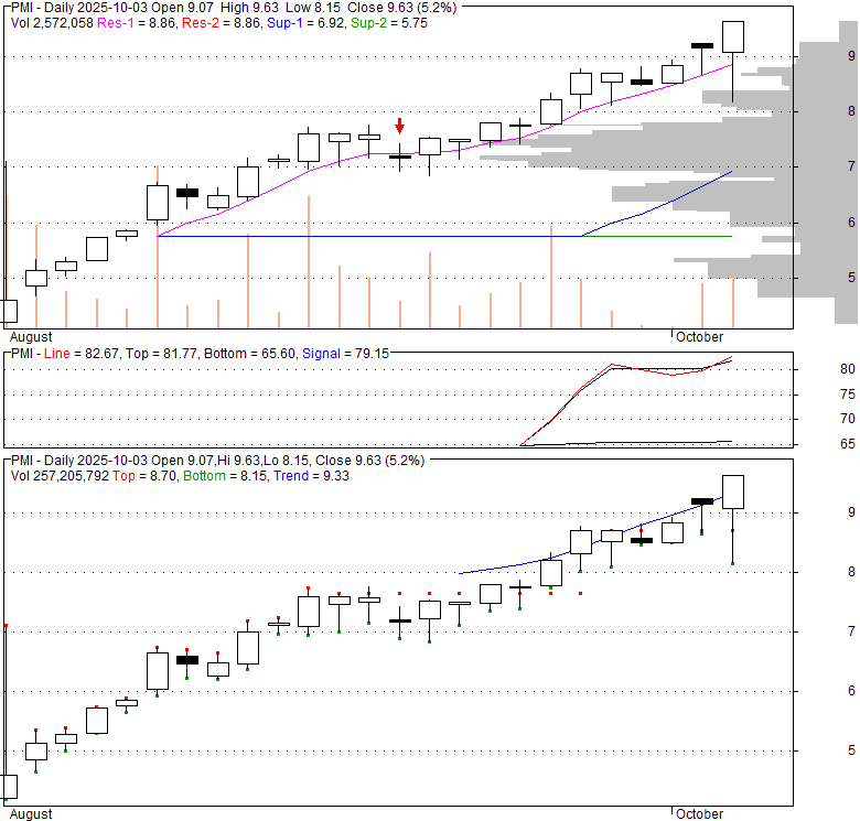 Price has closed above its short-term moving average. Short-term moving average is currently below mid-term; and below long-term moving average. From the relationship between price and moving averages: This stock is NEUTRAL in short-term; and NEUTRAL in mid-long term.[ PMI ] has closed Bollinger Bands are 0% narrower than normal.