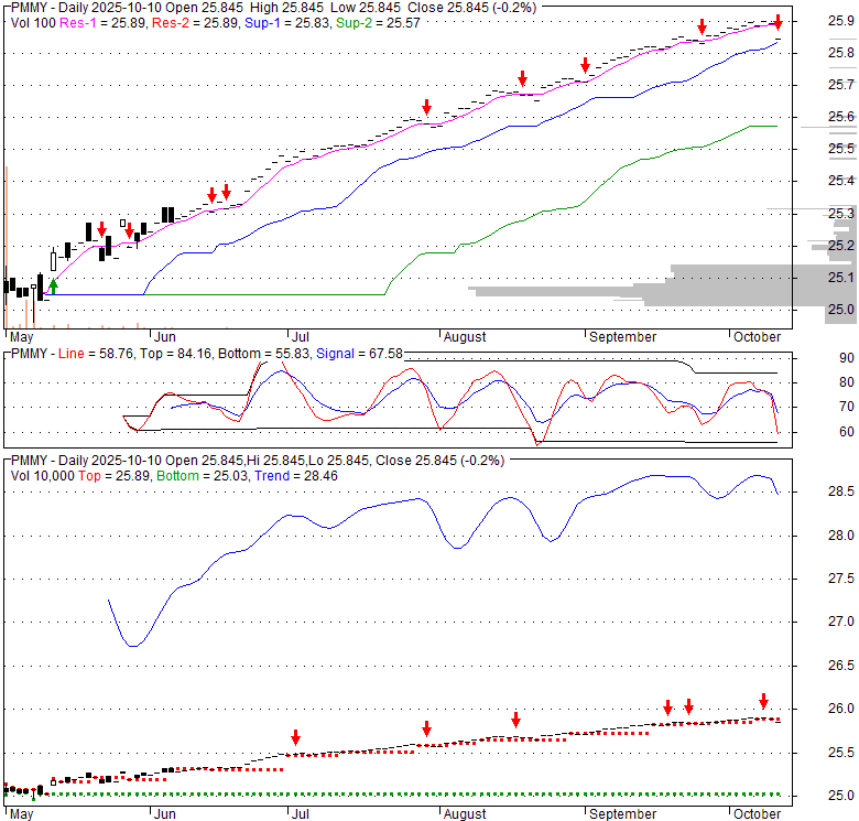 Price has closed below its short-term moving average. Short-term moving average is currently above mid-term; and above long-term moving average. From the relationship between price and moving averages: This stock is NEUTRAL in short-term; and BULLISH in mid-long term.[ PMMY ] has closed above bottom band by 25.6%. Bollinger Bands are 0% narrower than normal.