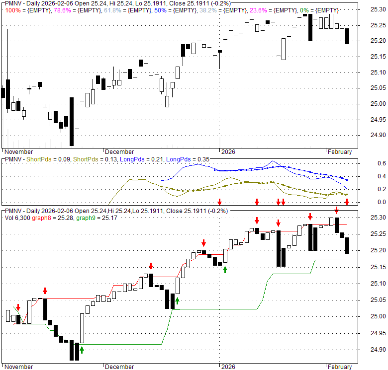 Price has closed below its short-term moving average. Short-term moving average is currently above mid-term; and below long-term moving average. From the relationship between price and moving averages: This stock is NEUTRAL in short-term; and NEUTRAL in mid-long term.[ PMNV ] has closed above bottom band by 17.4%. Bollinger Bands are 0% narrower than normal.