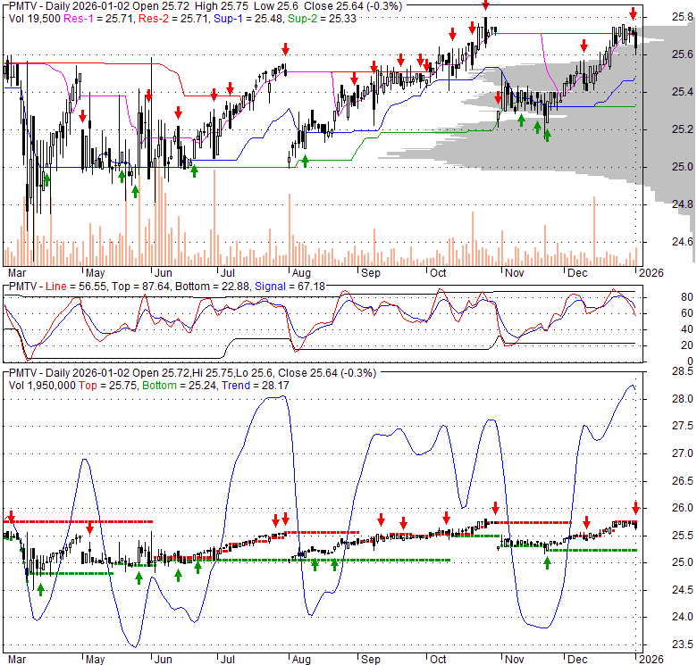 Price has closed below its short-term moving average. Short-term moving average is currently above mid-term; and above long-term moving average. From the relationship between price and moving averages: This stock is NEUTRAL in short-term; and BULLISH in mid-long term.[ PMTV ] has closed above bottom band by 49.1%. Bollinger Bands are 13.9% wider than normal. The current width of the bands does not suggest anything about the future direction or movement of prices.