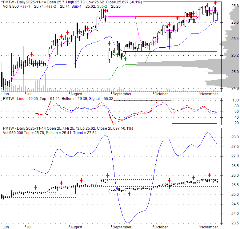 Price has closed below its short-term moving average. Short-term moving average is currently above mid-term; and above long-term moving average. From the relationship between price and moving averages: This stock is NEUTRAL in short-term; and BULLISH in mid-long term.[ PMTW ] has closed above bottom band by 44.7%. Bollinger Bands are 0% narrower than normal.