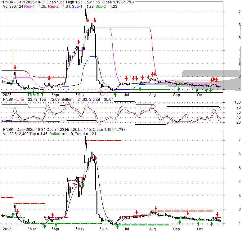Price has closed below its short-term moving average. Short-term moving average is currently below mid-term; and below long-term moving average. From the relationship between price and moving averages: This stock is BEARISH in short-term; and BEARISH in mid-long term.[ PNBK ] has closed above bottom band by 18.7%. Bollinger Bands are 45.5% narrower than normal. The narrow width of the bands suggests low volatility as compared to its normal range. The bands have been in this narrow range for 95 bars. This is a sign that the market may be about to initiate a new trend.