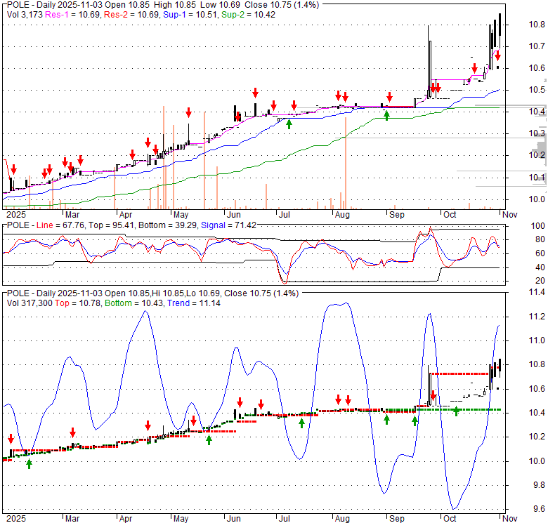Price has closed above its short-term moving average. Short-term moving average is currently above mid-term; and above long-term moving average. From the relationship between price and moving averages: This stock is BULLISH in short-term; and BULLISH in mid-long term.[ POLE ] has closed below upper band by 9.1%. Bollinger Bands are 222.5% wider than normal. The large width of the bands suggest high volatility as compared to its normal range. The bands have been in this wide range for 29 days. This is a sign that the current trend might continue.