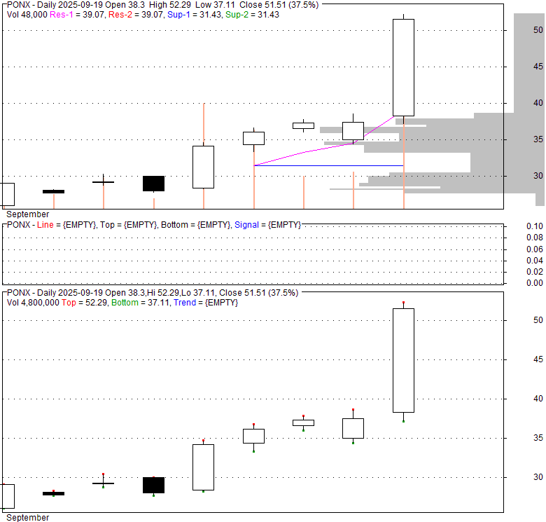 Price has closed above its short-term moving average. Short-term moving average is currently below mid-term; and below long-term moving average. From the relationship between price and moving averages: This stock is NEUTRAL in short-term; and NEUTRAL in mid-long term.[ PONX ] has closed below upper band by 18.2%. Bollinger Bands are 0% narrower than normal.