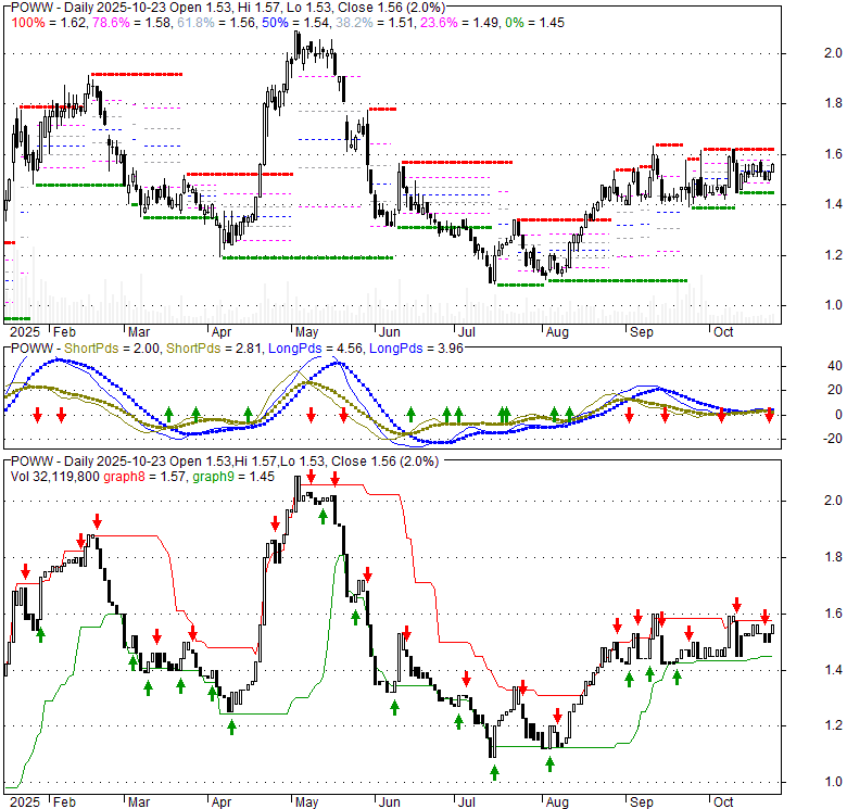 Price has closed above its short-term moving average. Short-term moving average is currently above mid-term; and above long-term moving average. From the relationship between price and moving averages: This stock is BULLISH in short-term; and BULLISH in mid-long term.[ POWW ] has closed below upper band by 22.6%. Bollinger Bands are 40.7% narrower than normal. The narrow width of the bands suggests low volatility as compared to its normal range. The bands have been in this narrow range for 0 bars. This is a sign that the market may be about to initiate a new trend.