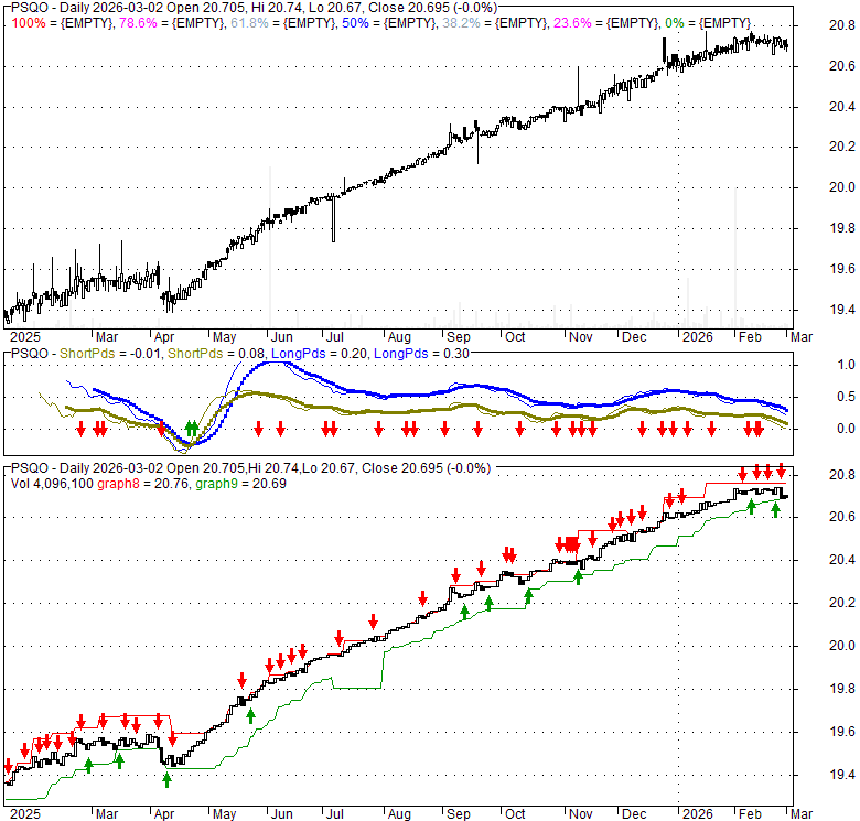 Price has closed below its short-term moving average. Short-term moving average is currently above mid-term; and above long-term moving average. From the relationship between price and moving averages: This stock is NEUTRAL in short-term; and BULLISH in mid-long term.[ PSQO ] has closed below upper band by 37.3%. Bollinger Bands are 39.7% narrower than normal. The current width of the bands does not suggest anything about the future direction or movement of prices.