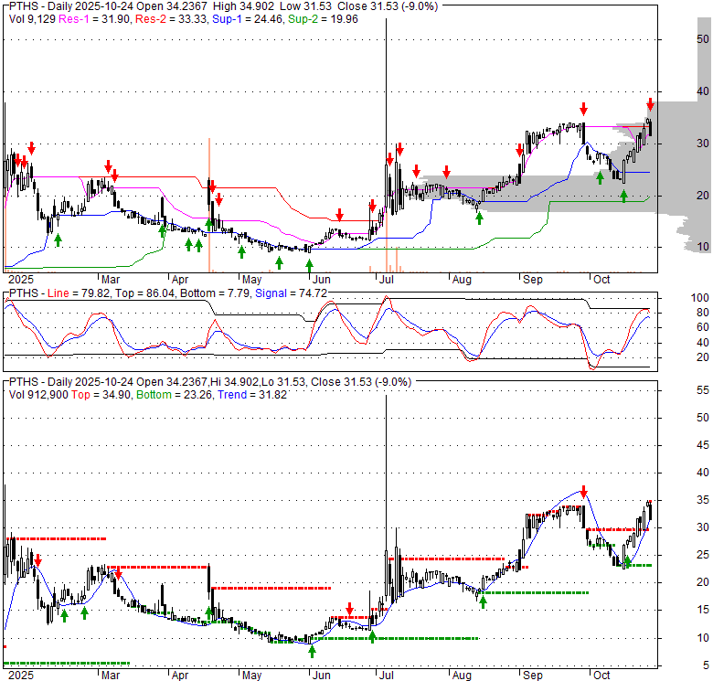 Price has closed above its short-term moving average. Short-term moving average is currently above mid-term; and above long-term moving average. From the relationship between price and moving averages: This stock is BULLISH in short-term; and BULLISH in mid-long term.[ PTHS ] has closed below upper band by 17.7%. Bollinger Bands are 60.6% wider than normal. The large width of the bands suggest high volatility as compared to its normal range. The bands have been in this wide range for 1 days. This is a sign that the current trend might continue.