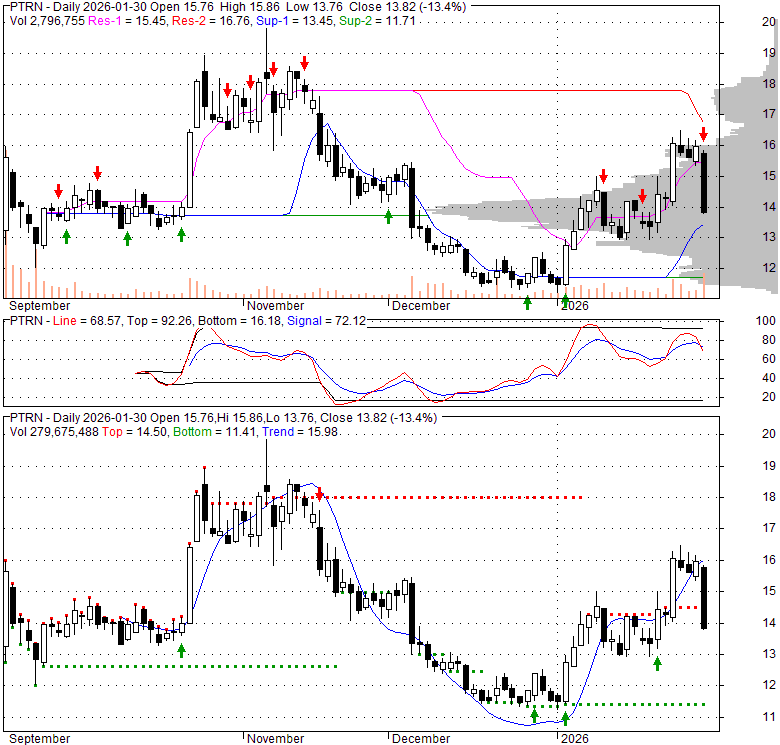 Price has closed below its short-term moving average. Short-term moving average is currently above mid-term; and below long-term moving average. From the relationship between price and moving averages: This stock is NEUTRAL in short-term; and NEUTRAL in mid-long term.[ PTRN ] has closed above bottom band by 36.7%. Bollinger Bands are 0% narrower than normal.