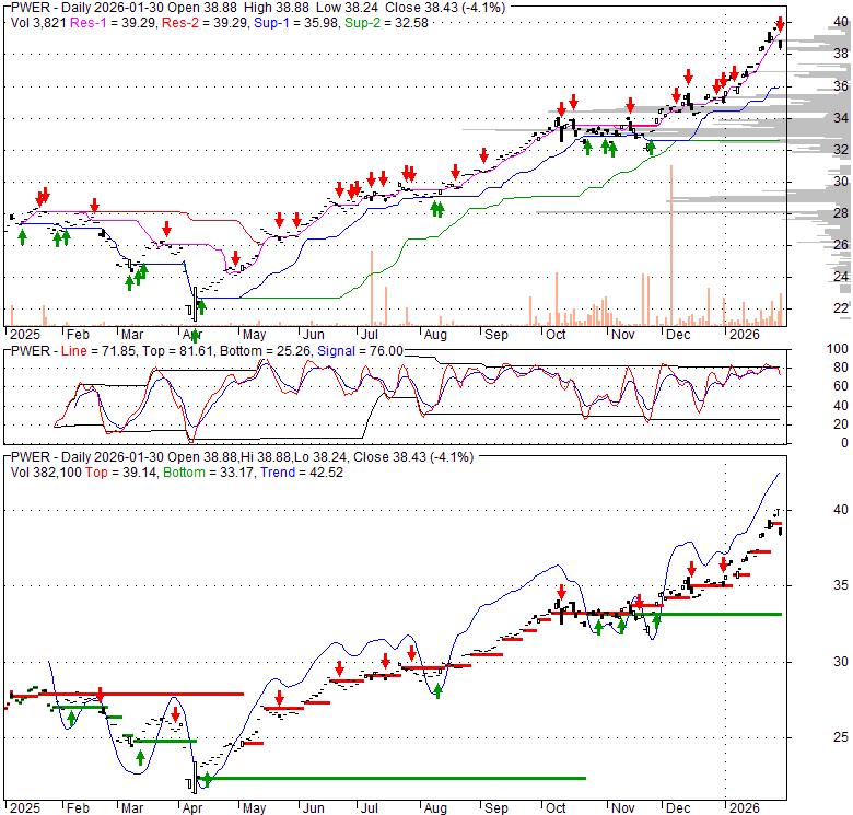 Price has closed below its short-term moving average. Short-term moving average is currently above mid-term; and above long-term moving average. From the relationship between price and moving averages: This stock is NEUTRAL in short-term; and BULLISH in mid-long term.[ PWER ] has closed below upper band by 40.6%. Bollinger Bands are 110.4% wider than normal. The large width of the bands suggest high volatility as compared to its normal range. The bands have been in this wide range for 11 days. This is a sign that the current trend might continue.