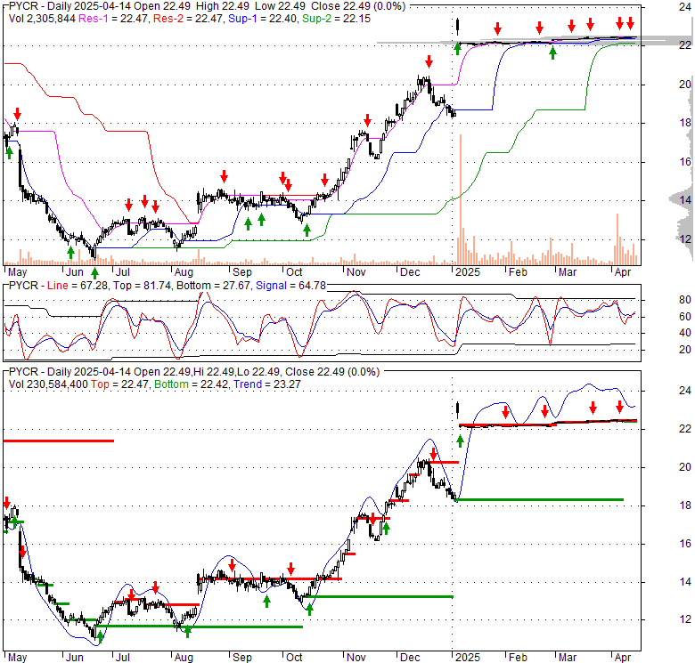 Price has closed above its short-term moving average. Short-term moving average is currently above mid-term; and above long-term moving average. From the relationship between price and moving averages: This stock is BULLISH in short-term; and BULLISH in mid-long term.[ PYCR ] has closed below upper band by 19.0%. Bollinger Bands are 93.8% narrower than normal. The narrow width of the bands suggests low volatility as compared to its normal range. The bands have been in this narrow range for 53 bars. This is a sign that the market may be about to initiate a new trend.