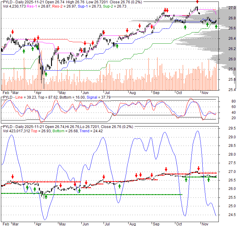 Price has closed above its short-term moving average. Short-term moving average is currently below mid-term; and above long-term moving average. From the relationship between price and moving averages: This stock is NEUTRAL in short-term; and NEUTRAL in mid-long term.[ PYLD ] has closed below upper band by 38.8%. Bollinger Bands are 50.3% narrower than normal. The narrow width of the bands suggests low volatility as compared to its normal range. The bands have been in this narrow range for 0 bars. This is a sign that the market may be about to initiate a new trend.