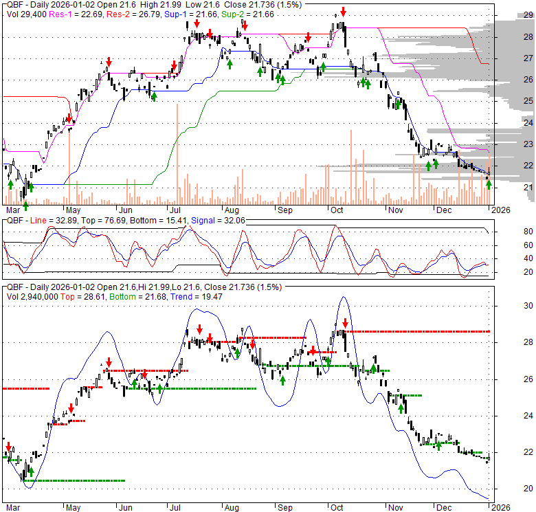 Price has closed above its short-term moving average. Short-term moving average is currently below mid-term; and below long-term moving average. From the relationship between price and moving averages: This stock is NEUTRAL in short-term; and BEARISH in mid-long term.[ QBF ] has closed above bottom band by 34.3%. Bollinger Bands are 55.1% narrower than normal. The narrow width of the bands suggests low volatility as compared to its normal range. The bands have been in this narrow range for 1 bars. This is a sign that the market may be about to initiate a new trend.