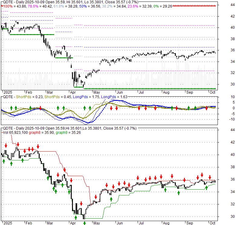 Price has closed below its short-term moving average. Short-term moving average is currently above mid-term; and above long-term moving average. From the relationship between price and moving averages: This stock is NEUTRAL in short-term; and BULLISH in mid-long term.[ QDTE ] has closed above bottom band by 33.8%. Bollinger Bands are 40.9% narrower than normal. The narrow width of the bands suggests low volatility as compared to its normal range. The bands have been in this narrow range for 5 bars. This is a sign that the market may be about to initiate a new trend.