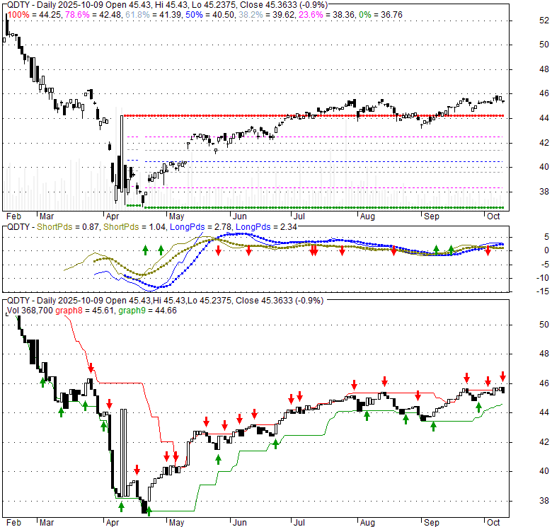 Price has closed below its short-term moving average. Short-term moving average is currently above mid-term; and above long-term moving average. From the relationship between price and moving averages: This stock is NEUTRAL in short-term; and BULLISH in mid-long term.[ QDTY ] has closed above bottom band by 46.7%. Bollinger Bands are 47.4% narrower than normal. The narrow width of the bands suggests low volatility as compared to its normal range. The bands have been in this narrow range for 5 bars. This is a sign that the market may be about to initiate a new trend.