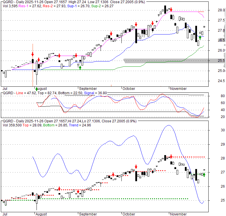 Price has closed above its short-term moving average. Short-term moving average is currently below mid-term; and below long-term moving average. From the relationship between price and moving averages: This stock is NEUTRAL in short-term; and NEUTRAL in mid-long term.[ QGRD ] has closed below upper band by 41.6%. Bollinger Bands are 0% narrower than normal.
