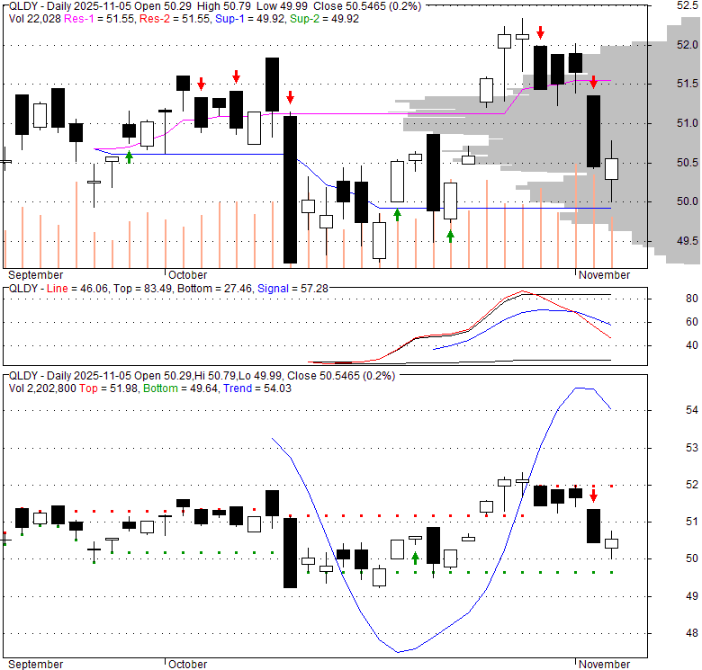 Price has closed below its short-term moving average. Short-term moving average is currently below mid-term; and below long-term moving average. From the relationship between price and moving averages: This stock is NEUTRAL in short-term; and NEUTRAL in mid-long term.[ QLDY ] has closed above bottom band by 40.5%. Bollinger Bands are 0% narrower than normal.