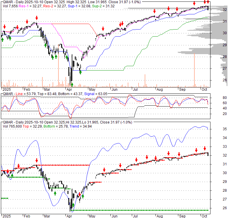 Price has closed below its short-term moving average. Short-term moving average is currently above mid-term; and above long-term moving average. From the relationship between price and moving averages: This stock is NEUTRAL in short-term; and BULLISH in mid-long term.[ QMAR ] has closed below the lower bollinger band by 5.5%. If price is in a downtrend band; this downward trend might continue. However a short term pullback inside the band is likely. Bollinger Bands are 41.6% narrower than normal. The narrow width of the bands suggests low volatility as compared to its normal range. The bands have been in this narrow range for 12 bars. This is a sign that the market may be about to initiate a new trend.
