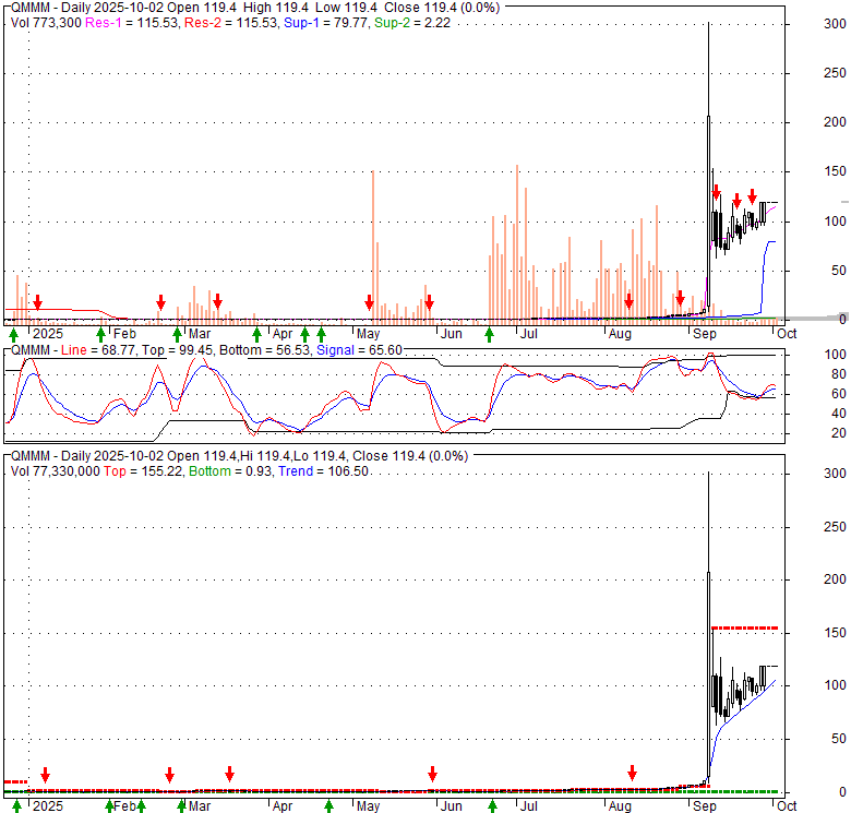 Price has closed below its short-term moving average. Short-term moving average is currently above mid-term; and above long-term moving average. From the relationship between price and moving averages: This stock is NEUTRAL in short-term; and BULLISH in mid-long term.[ QMMM ] has closed below upper band by 27.0%. Bollinger Bands are 49.8% wider than normal. The large width of the bands suggest high volatility as compared to its normal range. The bands have been in this wide range for 32 days. This is a sign that the current trend might continue.
