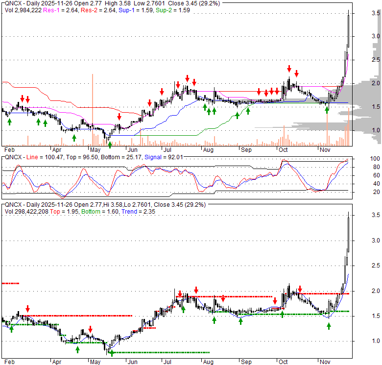 Price has closed above its short-term moving average. Short-term moving average is currently above mid-term; and above long-term moving average. From the relationship between price and moving averages: This stock is BULLISH in short-term; and BULLISH in mid-long term.[ QNCX ] has closed above the upper band by 22.5%. If price is in a uptrend band; this upward trend in price might continue. However a short term pullback inside the band is likely.Bollinger Bands are 470.2% wider than normal. The large width of the bands suggest high volatility as compared to its normal range. The bands have been in this wide range for 5 days. This is a sign that the current trend might continue.