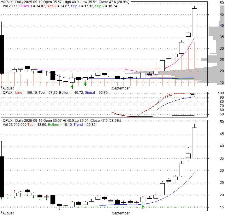 Price has closed above its short-term moving average. Short-term moving average is currently below mid-term; and below long-term moving average. From the relationship between price and moving averages: This stock is NEUTRAL in short-term; and NEUTRAL in mid-long term.[ QPUX ] has closed above the upper band by 5.3%. If price is in a uptrend band; this upward trend in price might continue. However a short term pullback inside the band is likely.Bollinger Bands are 0% narrower than normal.