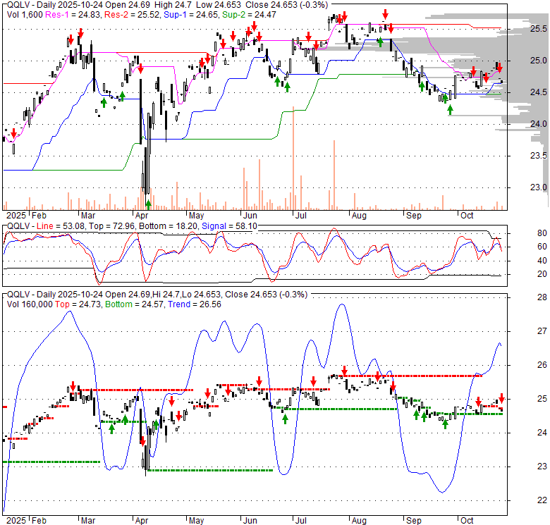 Price has closed below its short-term moving average. Short-term moving average is currently above mid-term; and below long-term moving average. From the relationship between price and moving averages: This stock is NEUTRAL in short-term; and NEUTRAL in mid-long term.[ QQLV ] has closed above bottom band by 29.9%. Bollinger Bands are 41% narrower than normal. The narrow width of the bands suggests low volatility as compared to its normal range. The bands have been in this narrow range for 6 bars. This is a sign that the market may be about to initiate a new trend.