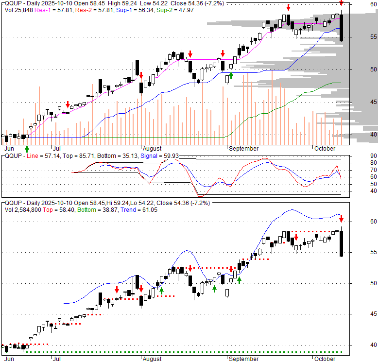 Price has closed below its short-term moving average. Short-term moving average is currently above mid-term; and below long-term moving average. From the relationship between price and moving averages: This stock is NEUTRAL in short-term; and NEUTRAL in mid-long term.[ QQUP ] has closed below the lower bollinger band by 2.4%. Although price has broken the lower band and a downside breakout is possible; the most likely direction for [ QQUP ] is to continue within current trading range. Bollinger Bands are 0% narrower than normal.