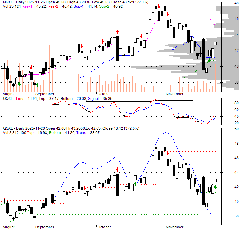 Price has closed above its short-term moving average. Short-term moving average is currently below mid-term; and below long-term moving average. From the relationship between price and moving averages: This stock is NEUTRAL in short-term; and NEUTRAL in mid-long term.[ QQXL ] has closed below upper band by 44.4%. Bollinger Bands are 0% narrower than normal.