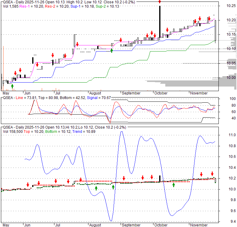 Price has closed below its short-term moving average. Short-term moving average is currently above mid-term; and above long-term moving average. From the relationship between price and moving averages: This stock is NEUTRAL in short-term; and BULLISH in mid-long term.[ QSEA ] has closed below upper band by 37.1%. Bollinger Bands are 15.9% narrower than normal. The current width of the bands does not suggest anything about the future direction or movement of prices.