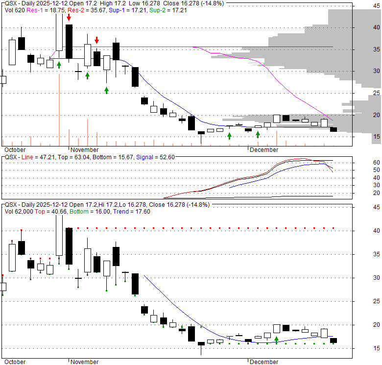Price has closed below its short-term moving average. Short-term moving average is currently below mid-term; and below long-term moving average. From the relationship between price and moving averages: This stock is NEUTRAL in short-term; and NEUTRAL in mid-long term.[ QSX ] has closed above bottom band by 17.9%. Bollinger Bands are 0% narrower than normal.