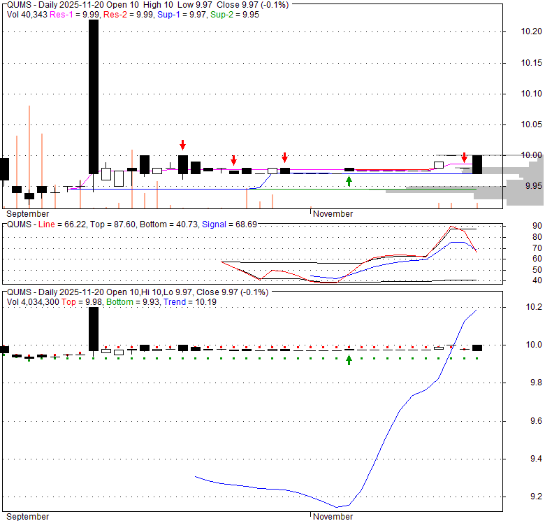 Price has closed below its short-term moving average. Short-term moving average is currently below mid-term; and below long-term moving average. From the relationship between price and moving averages: This stock is NEUTRAL in short-term; and NEUTRAL in mid-long term.[ QUMS ] has closed above bottom band by 30.3%. Bollinger Bands are 0% narrower than normal.