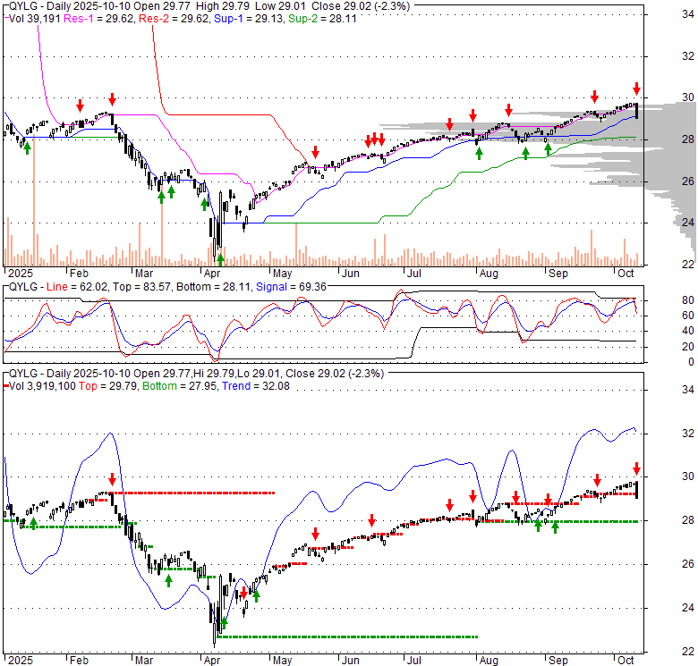 Price has closed below its short-term moving average. Short-term moving average is currently above mid-term; and above long-term moving average. From the relationship between price and moving averages: This stock is NEUTRAL in short-term; and BULLISH in mid-long term.[ QYLG ] has closed above bottom band by 17.3%. Bollinger Bands are 5.5% narrower than normal. The current width of the bands does not suggest anything about the future direction or movement of prices.