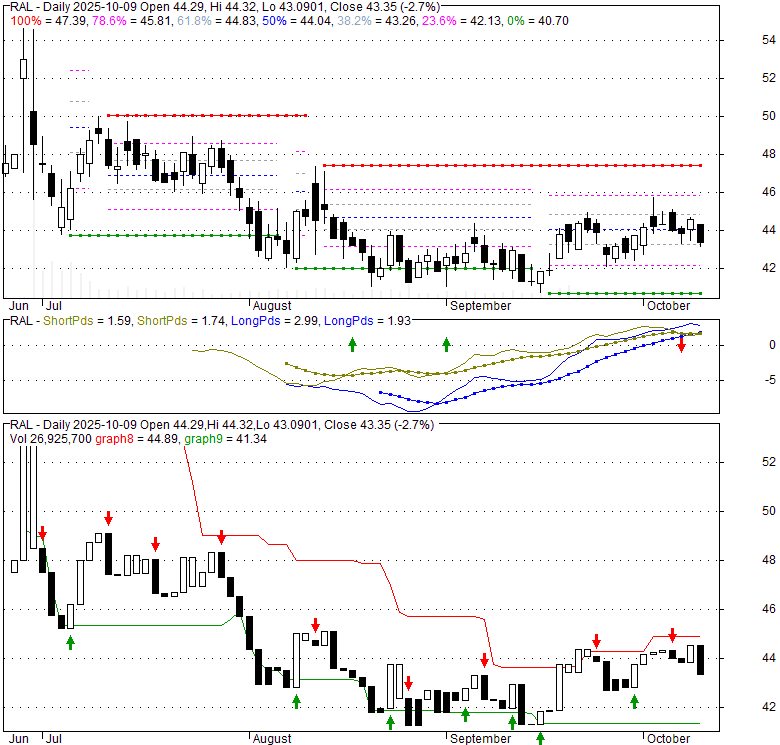 Price has closed below its short-term moving average. Short-term moving average is currently above mid-term; and below long-term moving average. From the relationship between price and moving averages: This stock is NEUTRAL in short-term; and NEUTRAL in mid-long term.[ RAL ] has closed above bottom band by 24.8%. Bollinger Bands are 0% narrower than normal.