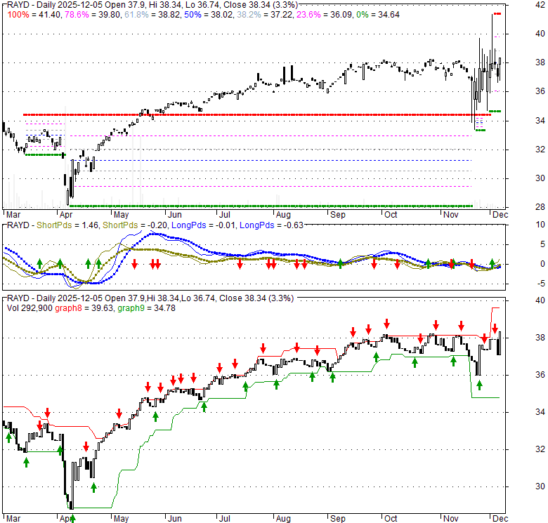 Price has closed above its short-term moving average. Short-term moving average is currently above mid-term; and above long-term moving average. From the relationship between price and moving averages: This stock is BULLISH in short-term; and BULLISH in mid-long term.[ RAYD ] has closed below upper band by 7.5%. Bollinger Bands are 87.2% wider than normal. The large width of the bands suggest high volatility as compared to its normal range. The bands have been in this wide range for 10 days. This is a sign that the current trend might continue.