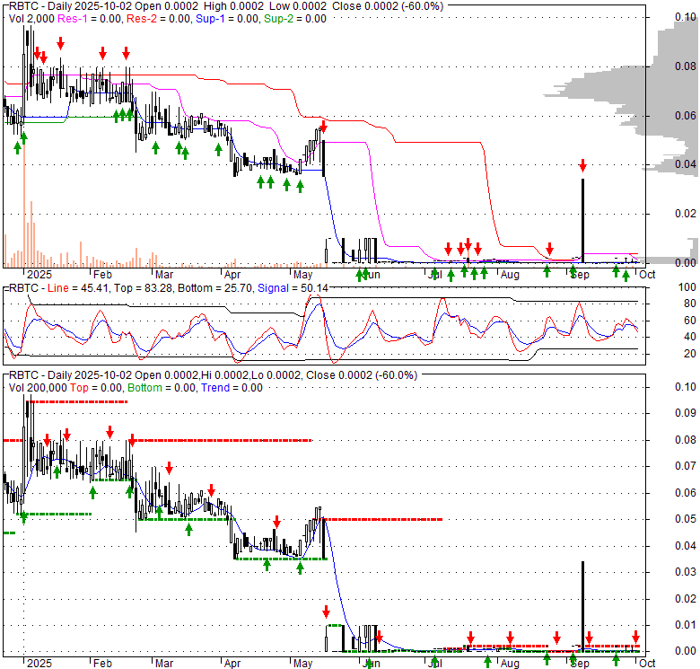 Price has closed below its short-term moving average. Short-term moving average is currently below mid-term; and below long-term moving average. From the relationship between price and moving averages: This stock is BEARISH in short-term; and BEARISH in mid-long term.[ RBTC ] has closed above bottom band by 38.4%. Bollinger Bands are 82.3% narrower than normal. The narrow width of the bands suggests low volatility as compared to its normal range. The bands have been in this narrow range for 70 bars. This is a sign that the market may be about to initiate a new trend.