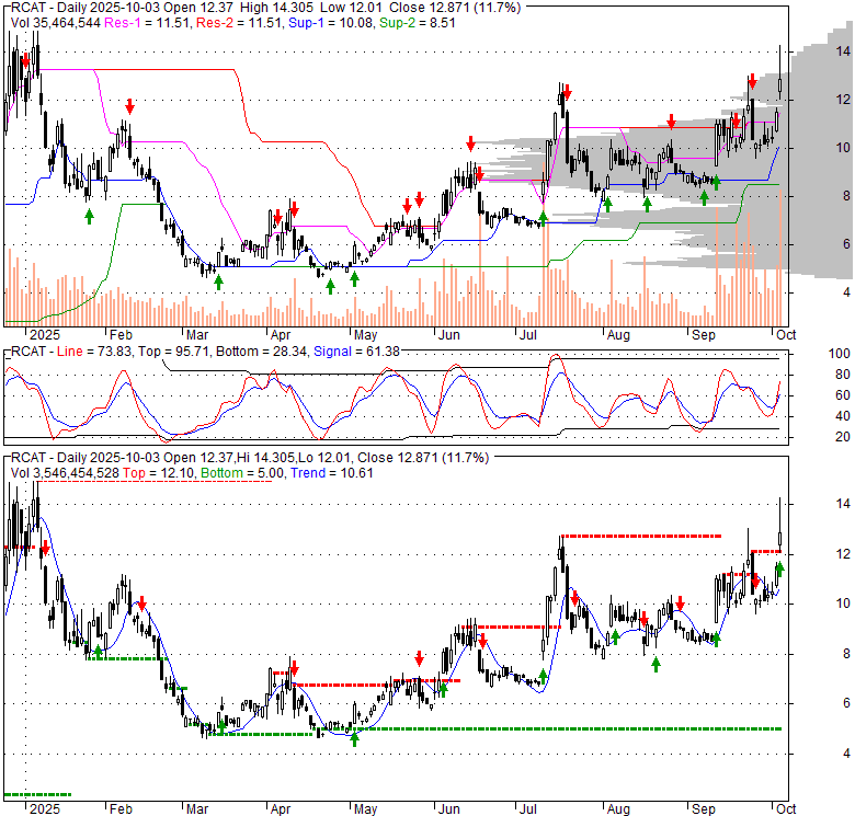 Price has closed above its short-term moving average. Short-term moving average is currently above mid-term; and above long-term moving average. From the relationship between price and moving averages: This stock is BULLISH in short-term; and BULLISH in mid-long term.[ RCAT ] has closed above the upper band by 17.5%. If price is in a uptrend band; this upward trend in price might continue. However a short term pullback inside the band is likely.Bollinger Bands are 4.8% narrower than normal. The current width of the bands does not suggest anything about the future direction or movement of prices.