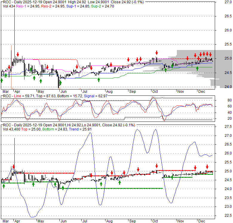 Price has closed below its short-term moving average. Short-term moving average is currently above mid-term; and above long-term moving average. From the relationship between price and moving averages: This stock is NEUTRAL in short-term; and BULLISH in mid-long term.[ RCC ] has closed below upper band by 44.8%. Bollinger Bands are 50% narrower than normal. The narrow width of the bands suggests low volatility as compared to its normal range. The bands have been in this narrow range for 0 bars. This is a sign that the market may be about to initiate a new trend.