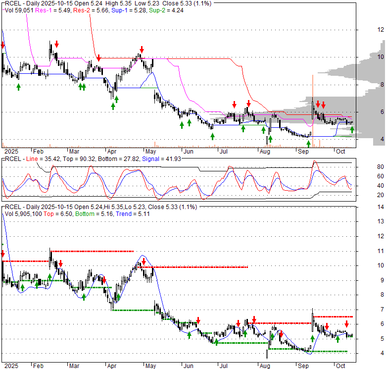 Price has closed below its short-term moving average. Short-term moving average is currently above mid-term; and below long-term moving average. From the relationship between price and moving averages: This stock is NEUTRAL in short-term; and NEUTRAL in mid-long term.[ RCEL ] has closed above bottom band by 36.6%. Bollinger Bands are 65.3% narrower than normal. The narrow width of the bands suggests low volatility as compared to its normal range. The bands have been in this narrow range for 7 bars. This is a sign that the market may be about to initiate a new trend.