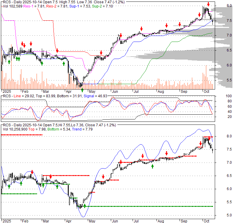 Price has closed below its short-term moving average. Short-term moving average is currently above mid-term; and above long-term moving average. From the relationship between price and moving averages: This stock is NEUTRAL in short-term; and BULLISH in mid-long term.[ RCS ] has closed above bottom band by 2.4%. Bollinger Bands are 82.9% wider than normal. The large width of the bands suggest high volatility as compared to its normal range. The bands have been in this wide range for 7 days. This is a sign that the current trend might continue.