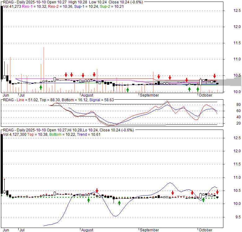 Price has closed below its short-term moving average. Short-term moving average is currently above mid-term; and below long-term moving average. From the relationship between price and moving averages: This stock is NEUTRAL in short-term; and NEUTRAL in mid-long term.[ RDAG ] has closed above bottom band by 31.4%. Bollinger Bands are 0% narrower than normal.