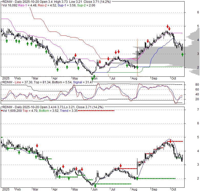 Price has closed above its short-term moving average. Short-term moving average is currently below mid-term; and above long-term moving average. From the relationship between price and moving averages: This stock is NEUTRAL in short-term; and NEUTRAL in mid-long term.[ RDNW ] has closed above bottom band by 41.1%. Bollinger Bands are 50.1% wider than normal. The large width of the bands suggest high volatility as compared to its normal range. The bands have been in this wide range for 6 days. This is a sign that the current trend might continue.